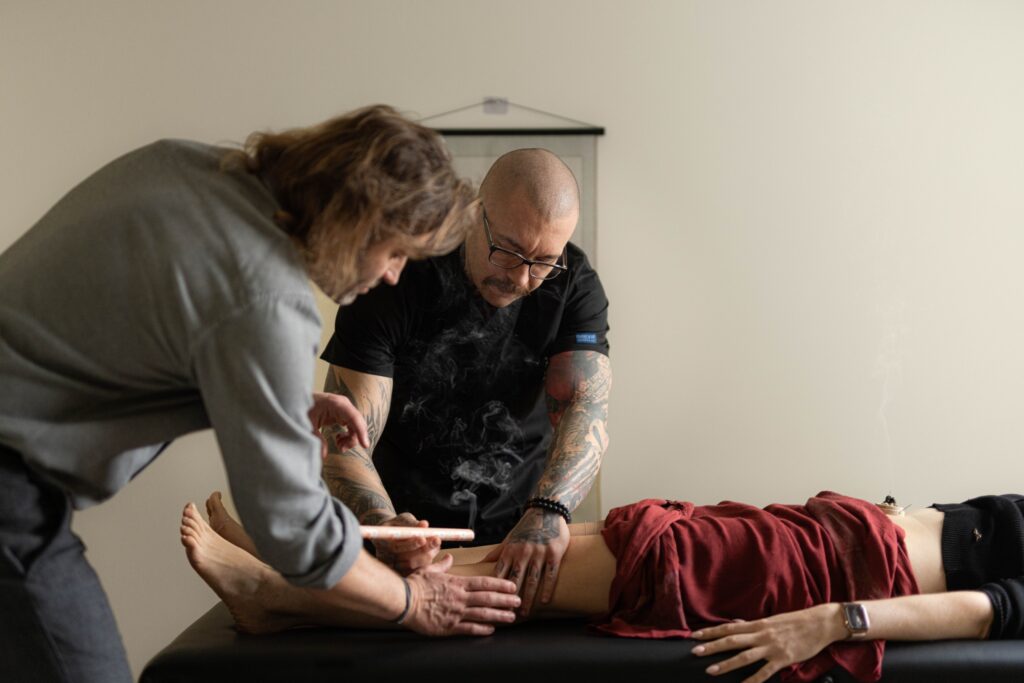Podczas pierwszej sesji wprowadziliśmy igły w punktach ST25 i SP10, aby rozluźnić zrosty powięziowe w obrębie blizny, oraz GB34 i ST36, by odciążyć pasmo i poprawić ślizg w obrębie kolana. Dodatkowo pracowaliśmy na punkcie BL54, by skorygować ustawienie stawu krzyżowo-biodrowego.